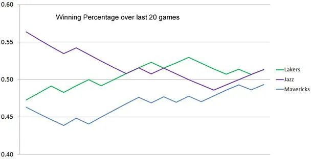 Come mostrato dai tre andamenti, la tendenza delle ultime settimane è chiaramente di risalita per Dallas, autrice di vittorie esaltanti come quella in rimonta di qualche giorno fa contro i Bulls; ondivaga per i Lakers, che hanno subito una flessione nel rendimento proprio nel momento in cui sembravano essere in grado di prendere un po’ di margine e addirittura puntare ad un’ulteriore miglioria della posizione ai Playoff, cercando di avvicinare Houston e Golden State; calante per i Jazz, arrivati all’All Star Game in vantaggio rispetto a tutte le altre contendenti e con un calendario sulla carta più abbordabile, dato l’elevato numero di partite contro squadre non presenti nella griglia della post season e soprattutto la gran quantità di match da disputare in casa, dove storicamente i Jazz riescono a far pesare il fattore campo, ed in realtà rivelatosi un cammino tutt’altro che semplice, con il record di 4-12 nelle ultime settimane che è lì a testimoniarne le difficoltà.