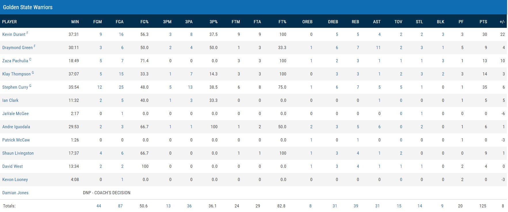 Ai padroni di casa basta il duo Curry-Durant per vincere una partita che non li ha mai visti in svantaggio nell’intero secondo tempo. I due compagni di squadra hanno infatti segnato quasi il 50% dei punti totali di Golden State: 35 punti per l’MVP e 30 per Kevin Durant non hanno lasciato scampo ai Blazers.