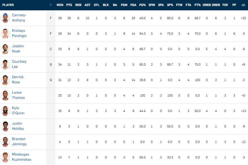 Il match inizia con i padroni di casa decisamente più in partita, riuscendo a toccare addirittura 18 punti di vantaggio. Nel secondo tempo però viene fuori tutto il talento dei Knicks (vedi Porzingis – Anthony) che realizza la rimonta e chiude la partita con la bomba del sorpasso di Carmelo a 50 secondi dal termine del match.