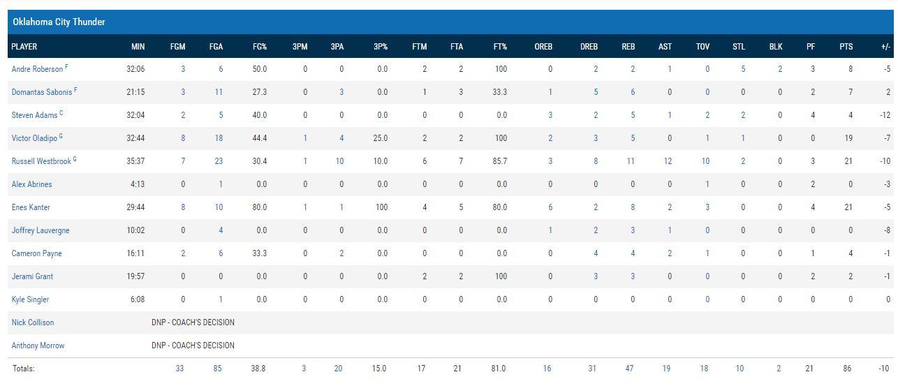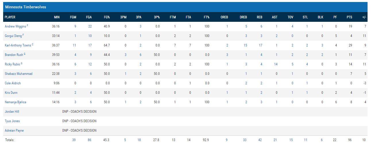 Sembrano aver ingranato, invece, i Minnesota Timberwolves, che sul parquet di casa hanno sconfitto gli Oklahoma City Thunder centrando la terza vittoria consecutiva. Serata dai due volti per Russell Westbrook, che chiude sì con la tripla doppia (21 punti, 11 rimbalzi, 12 assist), ma aggiunge anche 10 palle perse ed un pessimo 7/23 dal campo; 21 i punti messi a segno anche da Enes Kanter in uscita dalla panchina. Dall’altra parte, invece, sarà un caso, ma da quando Towns ha ricominciato a giocare ai livelli lasciati intravedere lo scorso anno Minnesota ha ricominciato a correre: complice anche l’assenza di Lavine, la prima scelta al Draft dello scorso anno si carica la squadra sulle spalle chiudendo con 29 punti e 17 rimbalzi, andando a formare un’ottima coppia con un Rubio sempre più positivo (14 punti e 14 assist).