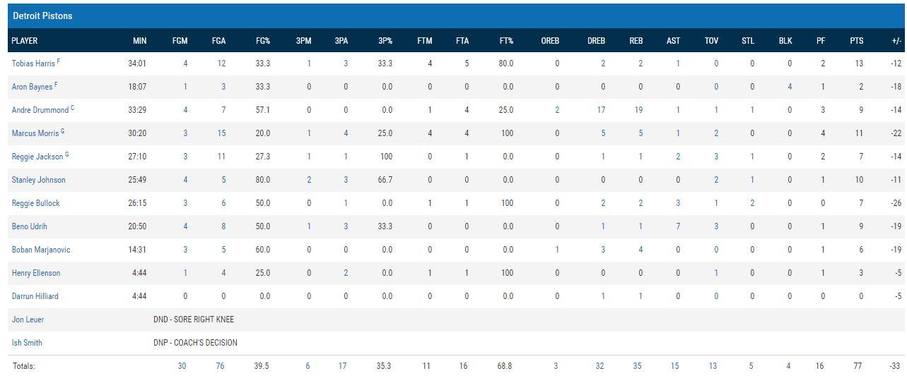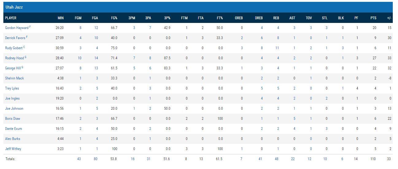 Passeggiata di salute per gli Utah Jazz, che sul parquet di casa annientano letteralmente i Detroit Pistons. Match vagamente equilibrato nel primo tempo, che subisce però un violento scossone nella ripresa, quando i padroni di casa allungano con i canestri di Hayward, Hood e Hill. Tutti e tre chiuderanno sopra i 20 punti (20 il primo, 27 il secondo, 22 il terzo con 5/6 da tre punti).