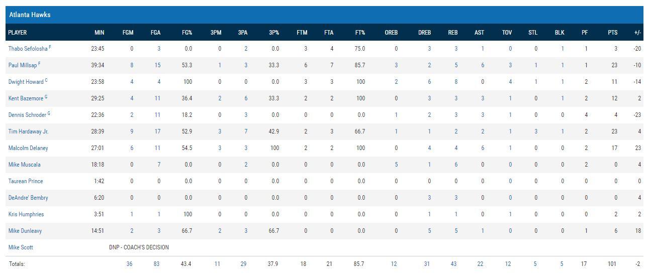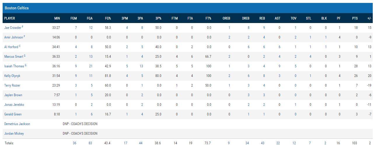 Il tentativo di Millsap sulla sirena non va a bersaglio, sancendo così la vittoria degli ospiti. Top-scorer di serata Isaiah Thomas, autore di 28 punti, ben supportato dall’uomo che non ti aspetti: Kelly Olynyk, che chiude con 26 punti e 8 rimbalzi, frutto di un ottimo 4/5 dalla lunga distanza. Per gli Hawks, invece, 23 punti ciascuno per Millsap e Hardaway Jr.