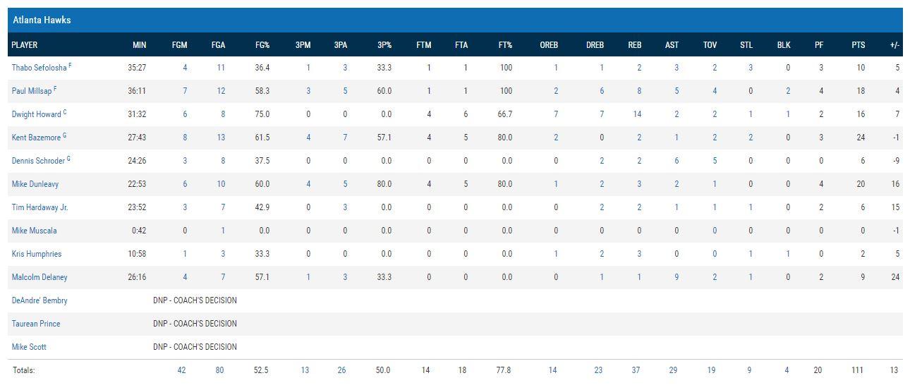 Nonostante la sconfitta, non si può non aprire la scheda sulla partita dei Bucks senza prima vedere quanto fatto da Giannis Antetokounmpo: anche questa notte il greco ha dato spettacolo, chiudendo con 33 punti (13/22 al tiro), 8 rimbalzi, 6 assist, 3 stoppate e 2 palle recuperate. Una prestazione incredibile, l’ennesima, che non è però bastata a Milwaukee per avere la meglio di una Atlanta che, dopo un avvio difficile, è stata brava a rimettersi in carreggiata, mantenendo un buon margine di vantaggio per tutto il secondo tempo. Molto importante, da questo punto di vista, l’ultimo arrivato, Mike Dunleavy, che dopo aver già ben figurato all’esordio con la nuova maglia questa volta ha chiuso con 20 punti (4/5 da tre). 24 quelli messi a segno da un altrettanto positivo Bazemore, mentre Howard ne aggiunge 16 con 14 rimbalzi. Tra le fila dei Bucks menzione d’onore per Jabari Parker, che sfiora la tripla doppia (8 punti, 10 rimbalzi, 9 assist).