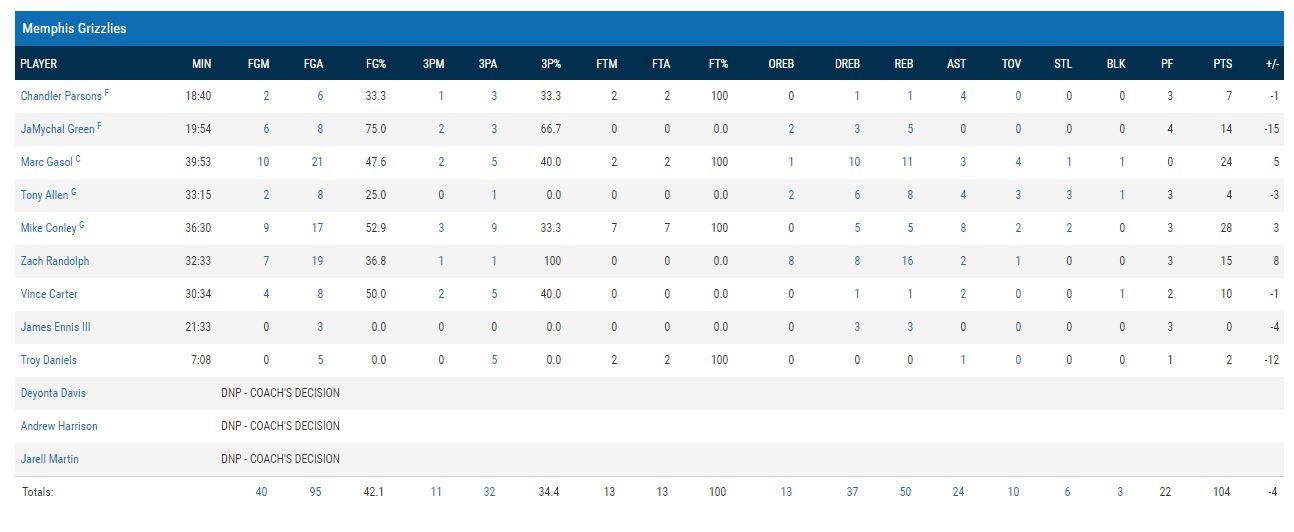 Ai Grizzlies non bastano i soliti 3: 28 punti per Conley, 24 con 11 rimbalzi per Gasol e 15 con 16 rimbalzi per Randolph in uscita dalla panchina.