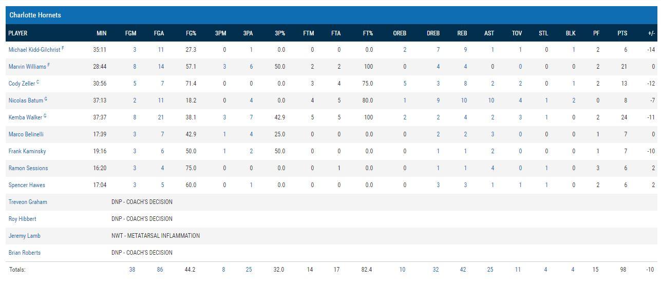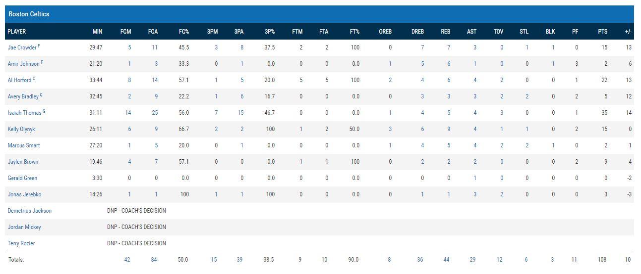 Quinta sconfitta consecutiva per i Charlotte Hornets del nostro Marco Belinelli (7 punti per lui), che vengono sconfitti dai Boston Celtics sul parquet del Td Garden. Trascinatore della squadra di coach Stevens è, come sempre, un grandissimo Isaiah Thomas, che con 35 punti permette ai Celtics di accumulare un buon margine di vantaggio nel secondo tempo e di mantenerlo fino alla fine. Positiva anche la serata di Al Horford, che chiude con 22 punti, mentre agli Hornets non bastano i 24 di Kemba Walker.