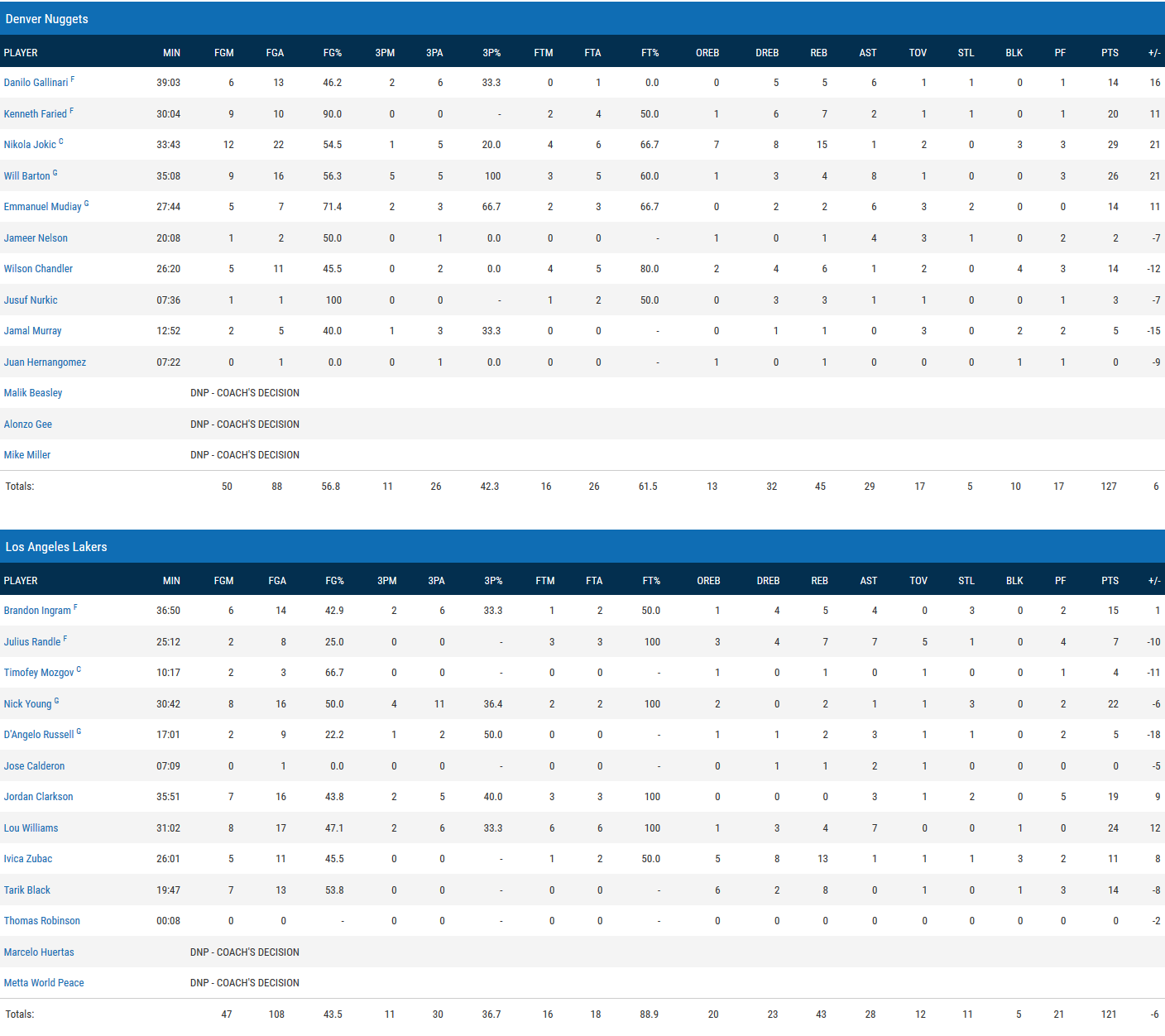 Successo eppure non così scontato dal momento che, dopo essere stati in vantaggio per tutta la partita e anche di confortevoli distanze come +19, i Nuggets sono stati recuperati dall’indiavolato parziale gialloviola di ultimo quarto (37-26). A guidare la disperata rimonta c’è Ingram, rientrato in quintetto base e autore di 15 punti.