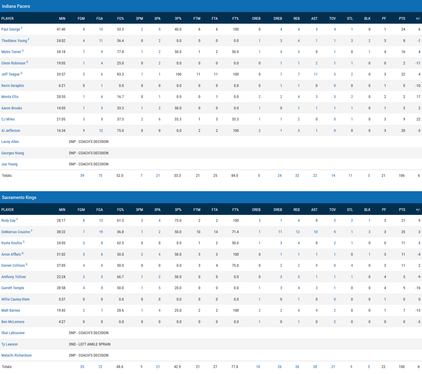 A frenare i Pacers non è bastata nemmeno la tripla doppia di Cousins con 25 punti, 12 rimbalzi e 10 assist.