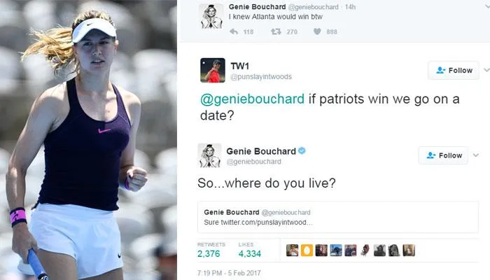 Durante il Super Bowl infatti, dopo che gli sfavoritissimi Atlanta Falcons si sono portati sul 21-0, la Bouchard aveva twittato “E comunque sapevo che Atlanta avrebbe vinto”, al quale John ha risposto simpaticamente “Se vincono i Patriots, usciresti con me?”. Convinta che i Falcons avessero ormai in pugno la partita, la numero 46 del seeding, ha risposto con un secco “Sicuro”.