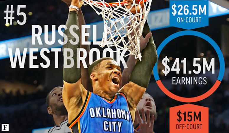 In questa stagione sta frantumando ogni record relativo alle triple doppie realizzate in una stagione, ma sembra non avere intenzione di fermarsi qui. Russell Westbrook, abbandonato da Kevin Durant nella solitudine di Oklahoma City, si è caricato la  squadra sulle spalle e la sta trascinando a suon di prestazioni roboanti. Recentemente è arrivato il rinnovo con la franchigia, che gli garantirà circa 85 milioni in tre anni (26.5 quest’anno), ulteriormente rimpinguato dai 15 milioni che gli arrivano dalle sponsorizzazioni off-court. Nel 2012 ha firmato con la Jordan, che nel 2015 ha rilasciato la sua prima signature shoe e che gli garantisce 1.5 milioni di dollari l’anno. I suoi altri accordi arrivano con brand come Subway , Zenith, Mountain Dew’s Kickstart, Kings & Jax e Barney’s. Il tutto per un consistente guadagno di 41.5 milioni annui, in questo 2017. Con 33 triple doppie.
