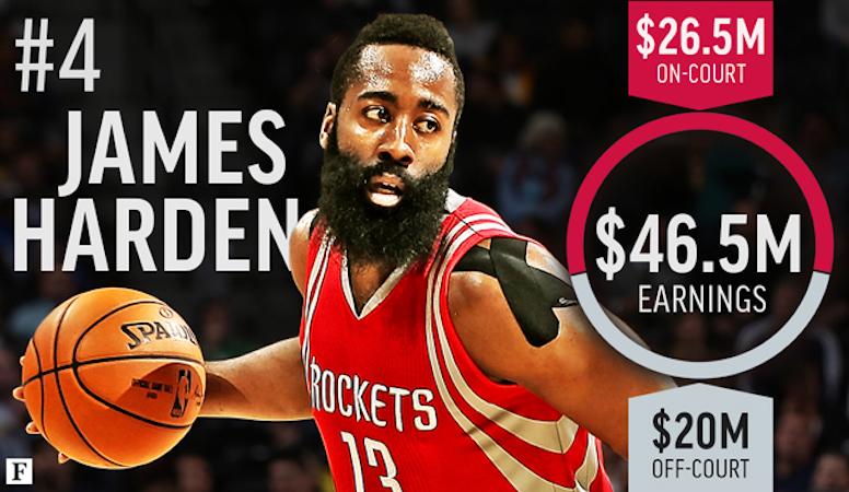 La scorsa estate Nike potrebbe aver perso una delle più redditizie fonti di introiti. L’azienda di Beaverton ha infatti deciso di non pareggiare l’offerta da 200 milioni in 13 anni offerta dall’AdidasJames Harden, principale fonte di introiti dell’atleta in forza agli Houston Rockets. Lo scorso anno è stato il 31esimo sportivo più pagato al mondo. Ai suoi 26.5 milioni di dollari garantiti da contratto (ha rinnovato da poco con un contratto da 118 milioni in 4 anni) devono aggiungersi le sponsorizzazioni derivanti da NBA 2K, Beats, New Era e BBVA, oltre a Stance e Papa John’s. Il totale ammonta a 46.5 milioni di dollari, ad appena mezzo milioni dal gradino più basso del podio.