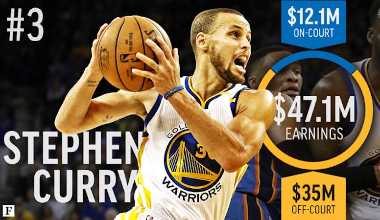 Steph Curry è stato uno dei primi atleti a firmare con l’emergente brand Under Armour, capace di strappare il due volte consecutive MVP della regular season a Nike con un contratto da 4 milioni annui. L’accordo è stato recentemente esteso fino al 2024, con la corresponsione al giocatore anche di una parte di quote azionarie. La sua canotta è la più venduta della lega e rischia di esserlo veramente a lungo. Grazie alle ulteriori sponsorizzazioni con Chase e alla produzione di scarpe personalizzate da parte di Under Armour stessa, i guadagni off-court di Steph ammontano a 35 milioni di dollari, il triplo di ciò che egli percepisce da contratto con i Golden State Warriors (accordo risalente al 2013-2014 da appena 44 milioni in 4 anni). Attenzione però: Curry sarà free agent quest’estate. Nel caso riformasse con la franchigia della Bay Area potrebbe arrivare a firmare un contratto da 209 milioni di dollari. E allora i guadagni totali potrebbero davvero far paura.