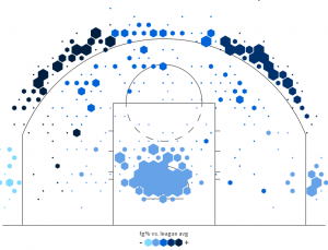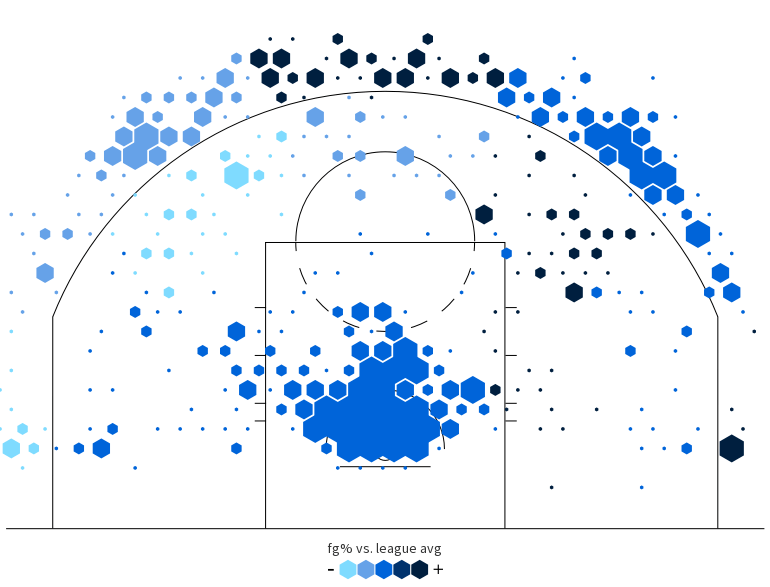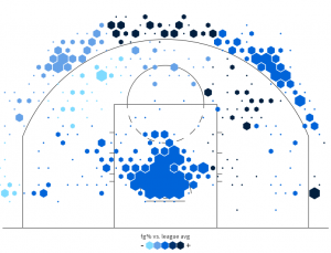 Dal confronto delle tre mappe di tiro si può notare come il gioco di Eric Gordon abbia conosciuto qualche significativa evoluzione nel corso della sua carriera. Sin dai tempi dei Clippers si è fatto apprezzare per le notevoli doti balistiche dall’arco e per le sue penetrazioni nel pitturato, e non è dunque una novità che Mike D’Antoni sappia sfruttare al massimo queste particolari doti. In particolare, dal suo approdo in Texas Gordon sembra aver rivalutato la tripla dall’angolo: se nel 2010-2011 e nel 2013-2014 le corner three tentate sono state rispettivamente 24 e 40, in maglia Rockets Gordon ha già fatto registrare 71 tentativi dall’angolo, che manda a bersaglio nel 40,8% dei casi. Il motivo è presto spiegato: se nelle sue precedenti esperienze in Nba era Gordon a gestire la stragrande maggioranza dei possessi della sua squadra, il magnetismo esercitato da Harden nei confronti delle difese avversarie fa sì che l’ex Pelicans possa mettere in mostra le sue doti da cecchino in situazioni di catch-and-shoot, cosa che la presenza di Anthony Davis in squadra gli consentiva di fare solo parzialmente.