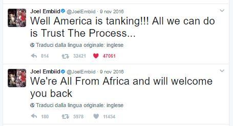 «Bene, l’America sta tankando. Tutto quello che possiamo fare è Trust the Process.» Dove il verbo tankare si riferisce alla pratica delle squadre NBA di passare un periodo di decadenza per ricostruire la squadra da zero. E Trust the Process il suo motto personale. E poi: «Veniamo tutti dall’Africa e vi riaccoglieremo». Genio assoluto. Credits to: @JoelEmbiid via Twitter.