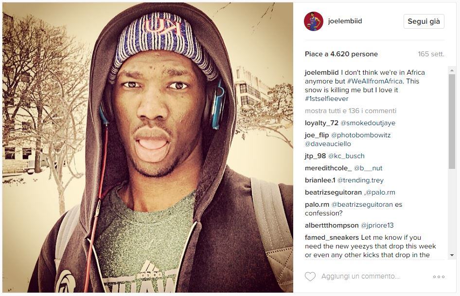 «Lo so che non siamo più in Africa, ma #siamotuttiafricani. Questa neve mi uccide ma la adoro #primoselfie» Credits to: @joelembiid via Instagram.