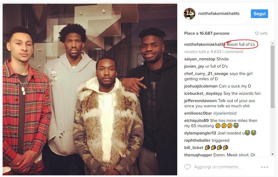 Embiid risponde alla provocazione della Khalifa con: «Dice quella con kilometri di C». Credits to: @notthefakemiakhalifa via Instagram.