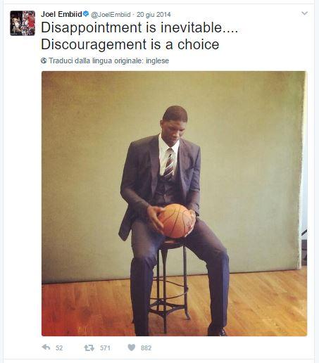 «La delusione è inevitabile… Lo sconforto è una scelta.» Queste le sue parole dopo l’infortunio che ha fatto saltare a Joel Embiid la prima stagione NBA. Credits to: @JoelEmbiid via Twitter.