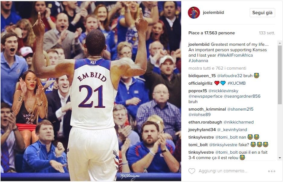 «Il momento più bello della mia vita… C’era una persona importante a supportare me e Kansas l’anno scorso. #siamotuttiafricani #Johanna.» Dove ovviamente “Johanna” è tratto dalle fusioni dei nomi delle coppie famose, come “Brangelina” fra Brad Pitt e Angelina Jolie. Credits to: @joelembiid via Instagram.