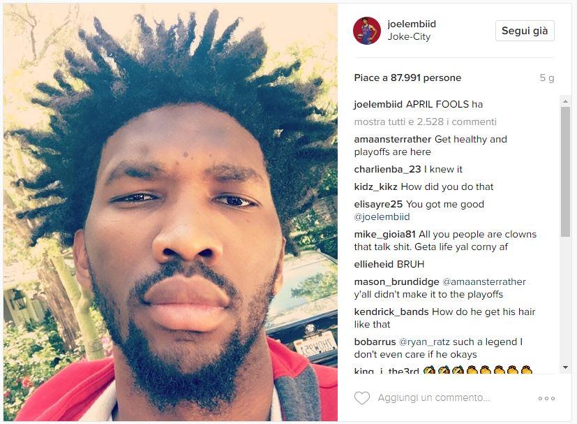 Joel il primo aprile carica questa foto: «SONO PROPRIO STUPIDO A TAGLIARMI I CAPELLI IN QUESTO MODO CHE C***O HO NELLA TESTA… GRANDISSIMO L. #SembroTroppoGiovane». Dove “L” sta sempre per “loser”, perdente. Ricordate il post di Mia Khalifa? E occhio alla localizzazione. Credits to: @joelembiid via Instagram.