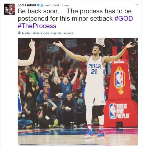 La chiave di lettura: «Torno presto… The Process deve essere rimandato per un piccolo contrattempo.» Credits to: @JoelEmbiid via Twitter.