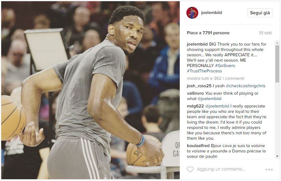 «Un GRANDE grazie ai nostri fan per il supporto mostrato durante tutta la stagione… Lo APPREZZIAMO davvero.» Credits to: @joelembiid via Instagram.