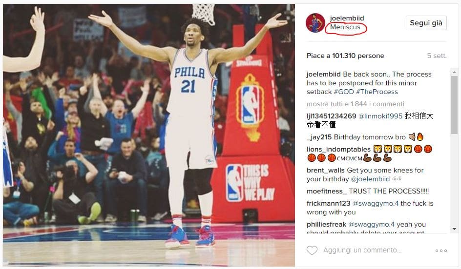 La versione su Instagram. «Menisco» è la sentenza-localizzazione. Credits to: @joelembiid via Instagram.