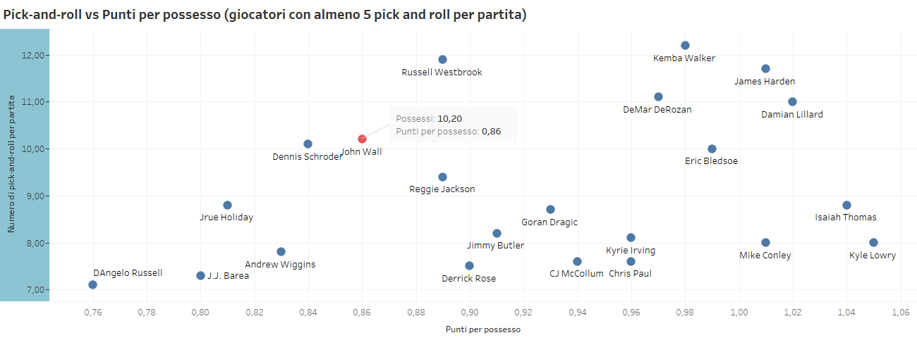 Nell’attacco di Washington l’uso del pick-and-roll, una delle armi più mortali della pallacanestro NBA contemporanea, è una costante e infatti John Wall ne fa largo utilizzo. In stagione regolare ha giocato 10.2 possessi di media in questa situazione, ovviamente come portatore di palla, che sono corrisposti circa al 40% delle sue giocate e che hanno prodotto per sé 0.86 punti per possesso con il 46% dal campo su 7.5 tentativi a partita (la seconda percentuale tra coloro che hanno giocato almeno 10 pick&roll a partita). Nonostante la efficacia sia migliore di altre point-guard d’élite della lega (come Harden e Westbrook) resta uno dei migliori in questo fondamentale, grazie alla sua completezza di movimenti – può accelerare e decelerare a piacimento – e di skills – può arrivare al ferro in un baleno come punire la difesa con un palleggio-arresto-tiro.