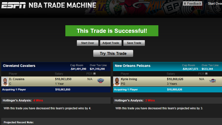 Che ne dite? Sarebbe… cosa sarebbe? Rischioso, in primis. Ma anche dirompente e sensato. I Pellies decretano fallito l’esperimento Twin Towers e DMC scade nell’estate 2018. Un anno ai Cavs per provare a vincere il titolo con LeBron non dev’essere male per l’ex centro dei Kings, che prenderà a spallate i lunghi dell’Est prima di seguire il suo Re ai Lakers. (Scenari di Cavs devastati dall’abbandono delle proprie superstar si sono susseguiti lungo tutto questo articolo, mi perdonerete). Kyrie troverebbe in Anthony Davis un compagno fenomenale e una co-star di primo rango. La città magari non è la migliore possibile, la destinazione magari non è gradita, ma Kyrie andrà dove i Cavs lo spediranno e la sua opinione in merito conta come Deron Williams nelle scorse Finals.