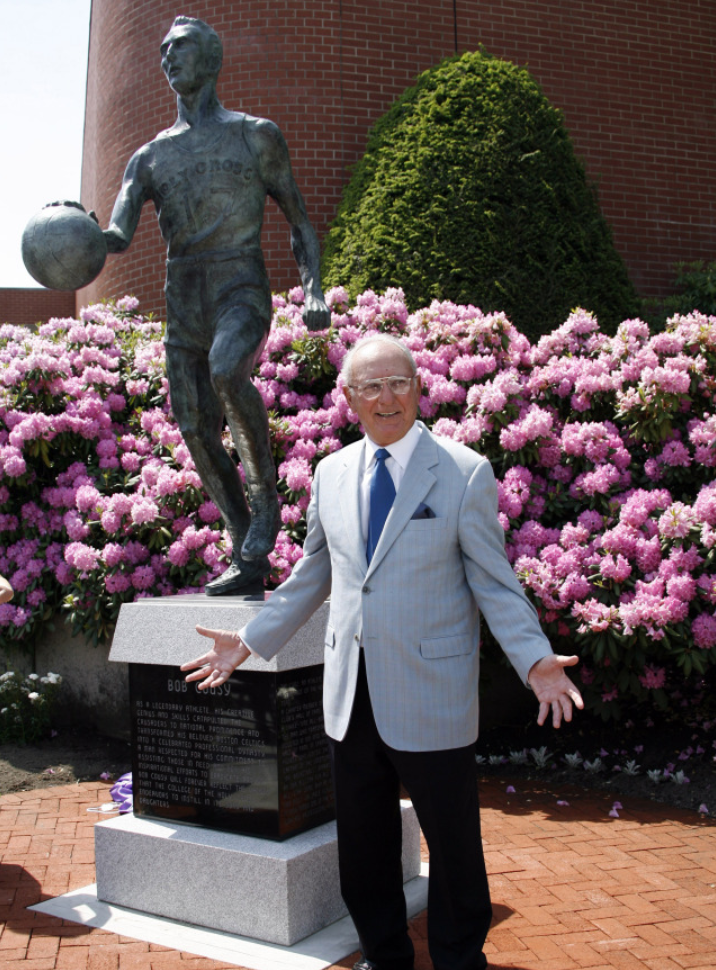 Bob Cousy è stato un altro campione dei Boston Celtics, anche se la città non gli ha dedicato alcuna scultura in bronzo. Ci ha pensato allora il College of the Holy Cross, che ha sede a Worcester, non molto lontano da Boston, dedicandogli una statua nel proprio campus. Al giorno della presentazione ha partecipato lo stesso Cousy, insieme allo staff del college e dei Celtics.