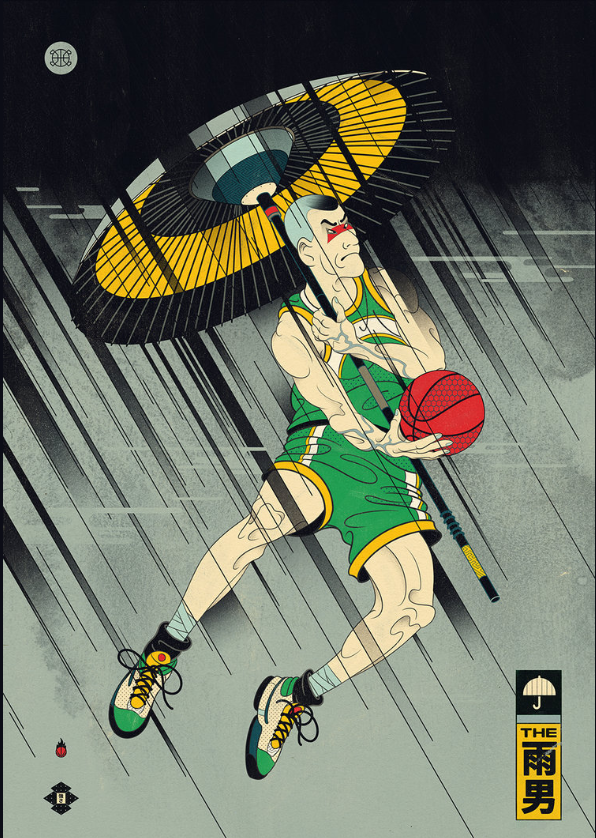 Shawn Kemp giocò per quasi tutta la sua carriera con i Seattle SuperSonics, arrivando a sfidare in Finale gli invincibili Bulls di Jordan a metà degli anni ’90. La sua illustrazione si riferisce al gioco di parole del suo soprannome, The Reign Man: reign, regnante, è molto simile alla parola rain, pioggia (fenomeno che a Seattle si verifica non di rado); ecco allora spiegato il motivo per il quale Kemp è stato disegnato in mezzo alla pioggia reggendo un ombrello.