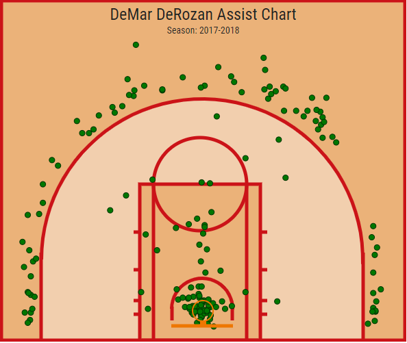 Il confronto delle due Assist Chart di DeRozan (tenete a mente che una è sull’intera scorsa stagione, una è fino a qualche partita fa) mette in mostra sia la miglior capacità di coinvolgimento di DeRozan che la nuova dimensione perimetrale di tutti i Raptors