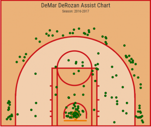 Dall’altro lato, tuttavia, la guardia dei Raptors ha mostrato un miglioramento straordinario in quella che era una delle sue più grandi lacune, nonché la causa primaria di molte delle critiche che regolarmente gli piovevano addosso da tutti i suoi detrattori: la visione periferica. La capacità di coinvolgere nell’azione i compagni e di metterli in condizione di sfruttare i raddoppi spesso sistematici che lo vedono coinvolto in molte situazioni, grazie anche alle migliori spaziature messe in campo dallo squadra canadese in questa stagione (fondamentale a tal proposito è la presenza di Ibaka e CJ Miles). Osserviamo un dato: lo scorso anno DeRozan viaggiava con il quinto Usage Rating assoluto (32,7) ma non riusciva a creare sostanzialmente nulla per i compagni, visto che il computo dei suoi passaggi si fermava a 35 a partita e il suo Assist/Ratio – il dato che calcola il numero di assistenze su 100 possessi – a 12,6 (per intenderci, quello di DeMarcus Cousins era 14,3). Queste statistiche in parte erano certamente determinate dal sistema offensivo dei Raptors di cui si è già accennato sopra, ma altrettanto certamente erano anche causate da evidenti lacune del soggetto in questione nel servire i compagni (lacune messe in mostra in maniera imbarazzante nella serie contro Cleveland) e da una naturale tendenza del giocatore a tenere il pallone tra le mani per troppo tempo, senza agevolare il flow della squadra.
