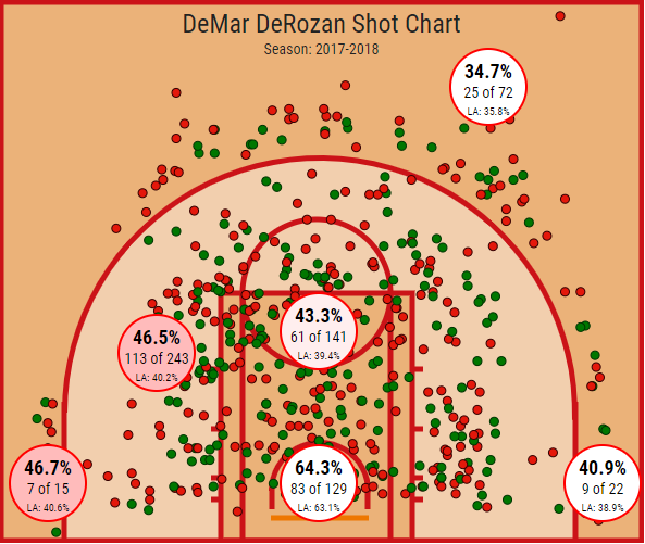 Tuttavia, più che alla quantità di tiri presi, è forse la tipologia degli stessi che rende manifesto il grande cambiamento nello stile di gioco di DeRozan – e più in generale di tutta Toronto – messo in mostra in questa prima parte di stagione; un cambiamento che ha finalmente fatto allineare la squadra canadese e il suo go-to-guy con la nuova NBA, fatta di ritmi alti ma soprattutto di costanti spaziature e ricerca esasperata del tiro da fuori, un fondamentale che al numero #10 – innamorato dei suoi fadeaway bryanteschi dal gomito – non era mai andato a genio. Ma se è vero – e lo è – che l’NBA è uno dei contesti maggiormente rappresentativi della veridicità della teoria evoluzionista darwiniana per la quale o ti adatti o soccombi, ecco che dovere impellente di DeRozan era quello di modificare radicalmente il proprio game style, rivoluzionando per prima la propria selezione di tiri. Detto fatto.