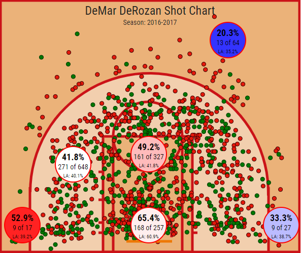 Importante è notare, a questo punto, come tale mutamento abbia influito positivamente sull’efficienza offensiva complessiva di DeRozan, che proprio quest’anno sta facendo registrare Offensive Rating e Net Rating più alti della sua carriera (113,6 e 8,3, rispettivamente 3,4 e 5 punti in più rispetto alla scorsa stagione).