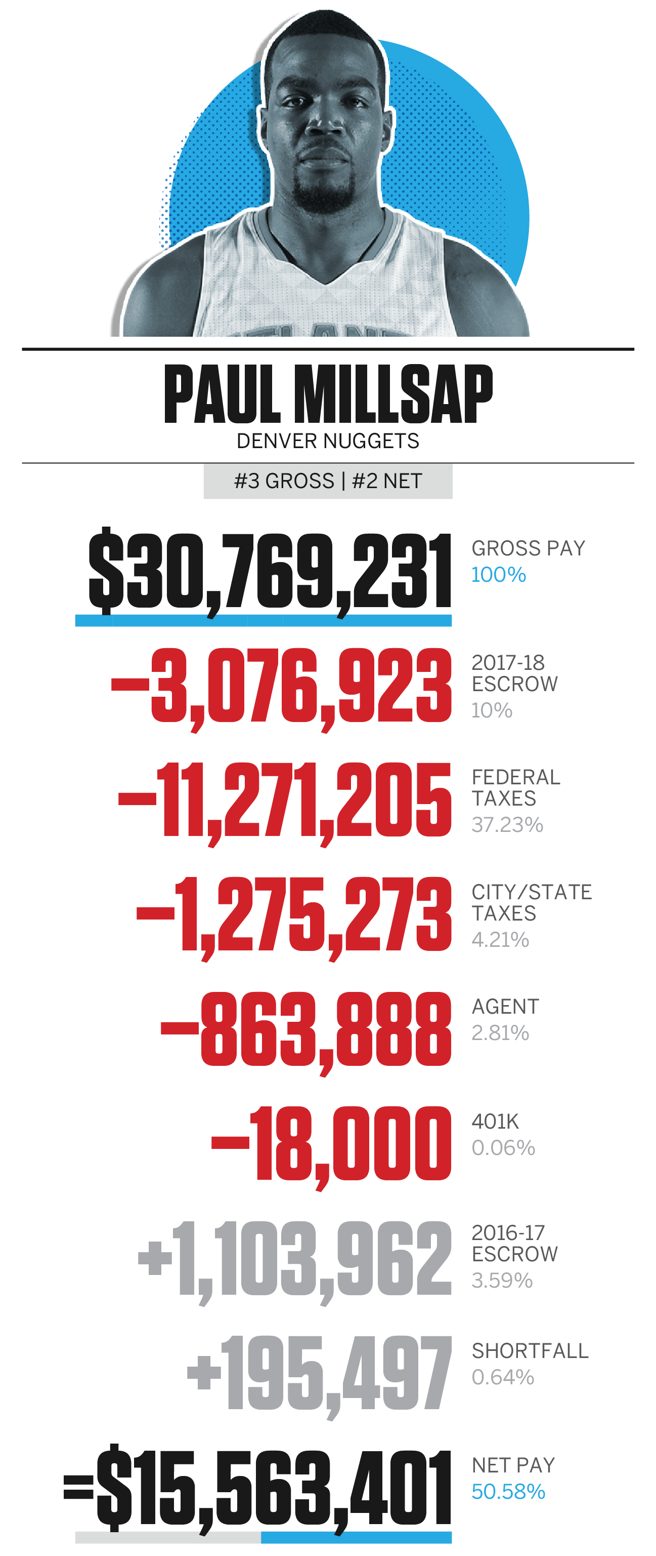 Attualmente sotto i ferri per un infortunio al polso sinistro, Millsap è passato in estate dagli Atlanta Hawks ai Denver Nuggets, coi quali ha firmato un contratto triennale di circa $90 milioni. Degli oltre $30 milioni che riceverà quest’anno, al netto di tutte le spese il lungo di Monroe dovrebbe percepire circa il 50.5%, equivalenti ad oltre $15.5 milioni.