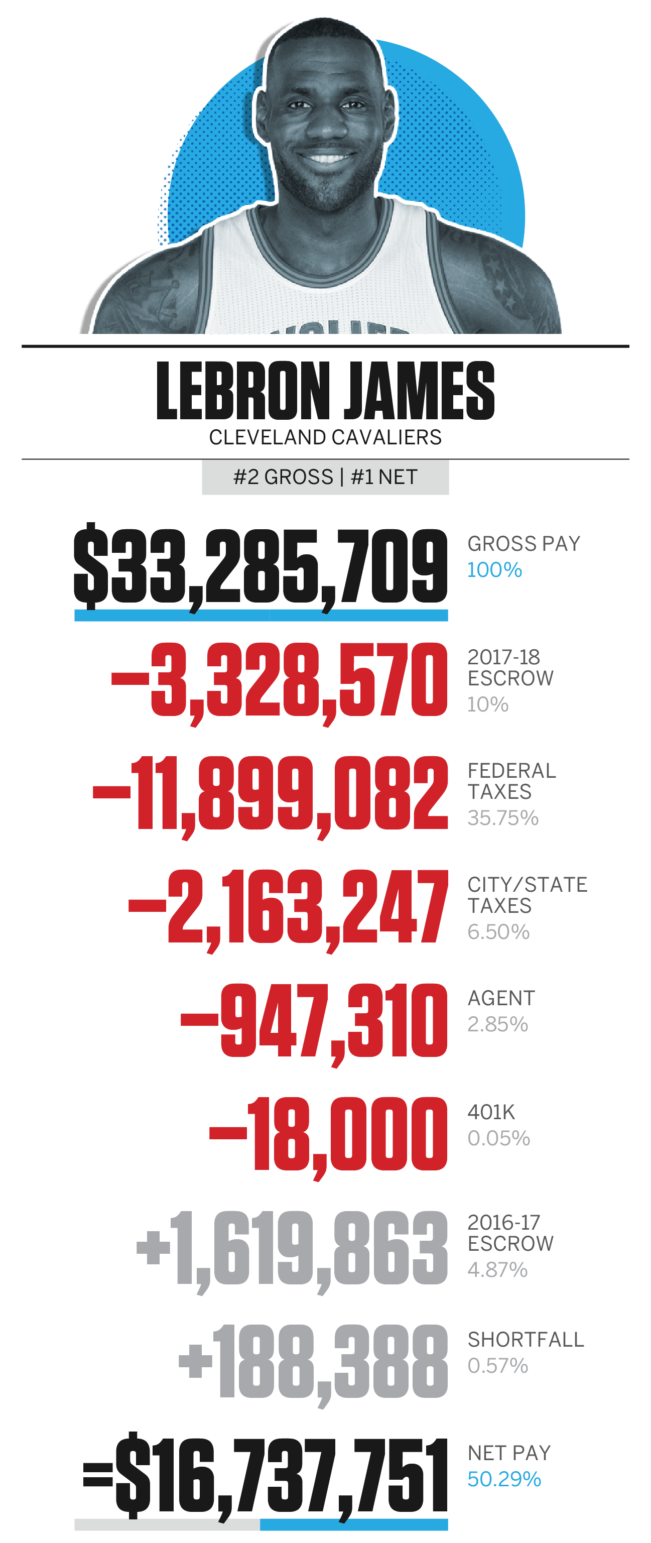 The King è sicuramente uno dei free-agent più ambiti di tutta la lega, avendo la possibilità di uscire dal suo contratto quest’estate. Intanto, da contratto, durante questa stagione guadagnerà complessivamente oltre $33.2 milioni di dollari, dei quali circa il 49.7% sarà detratto nelle varie spese: resteranno, comunque, oltre $16.7 milioni, ossia il compenso netto più alto della NBA.