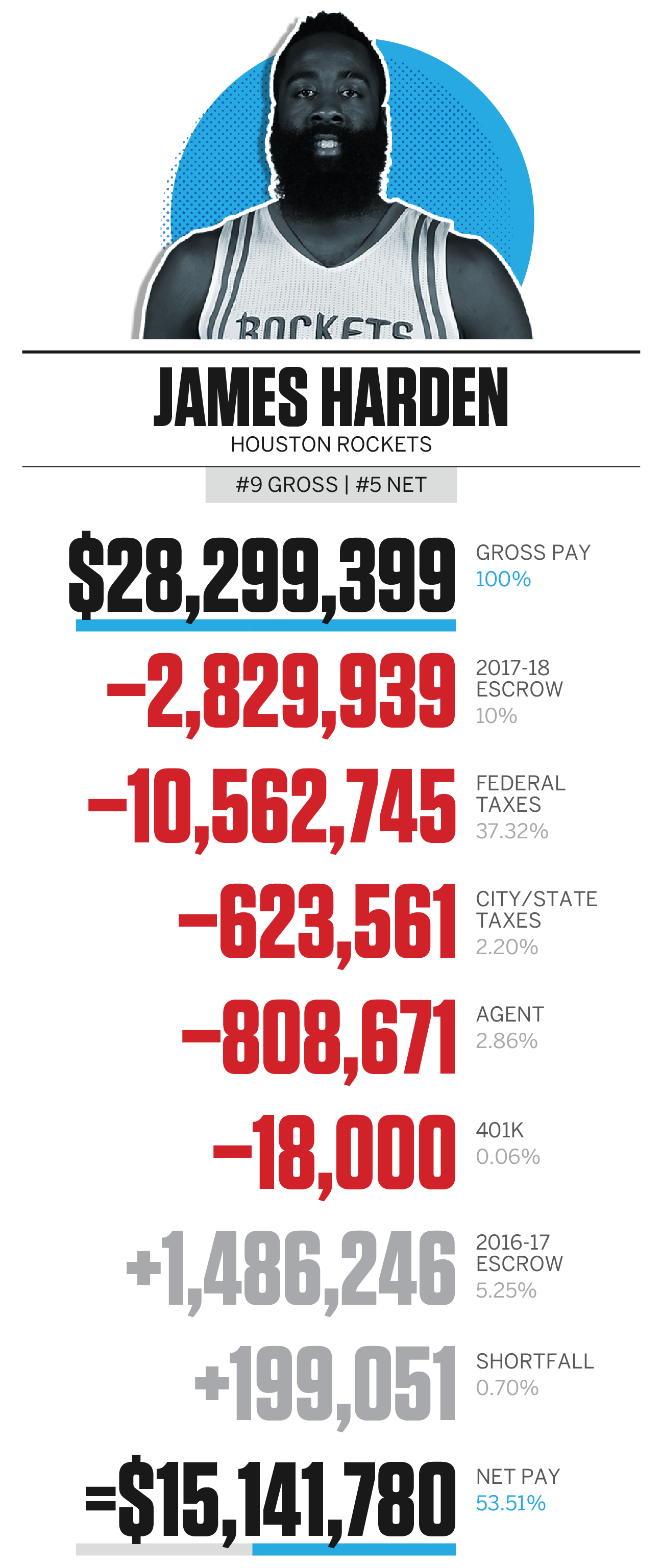 The Beard sta giocando una delle sue migliori stagioni in carriera e, grazie sopratutto al fatto che lo Stato del Texas non abbia alcuna state income tax, la sua percentuale di guadagno effettivo sullo stipendio è la più alta di tutta la classifica: 53.51%, che corrispondono a oltre $15 milioni.
