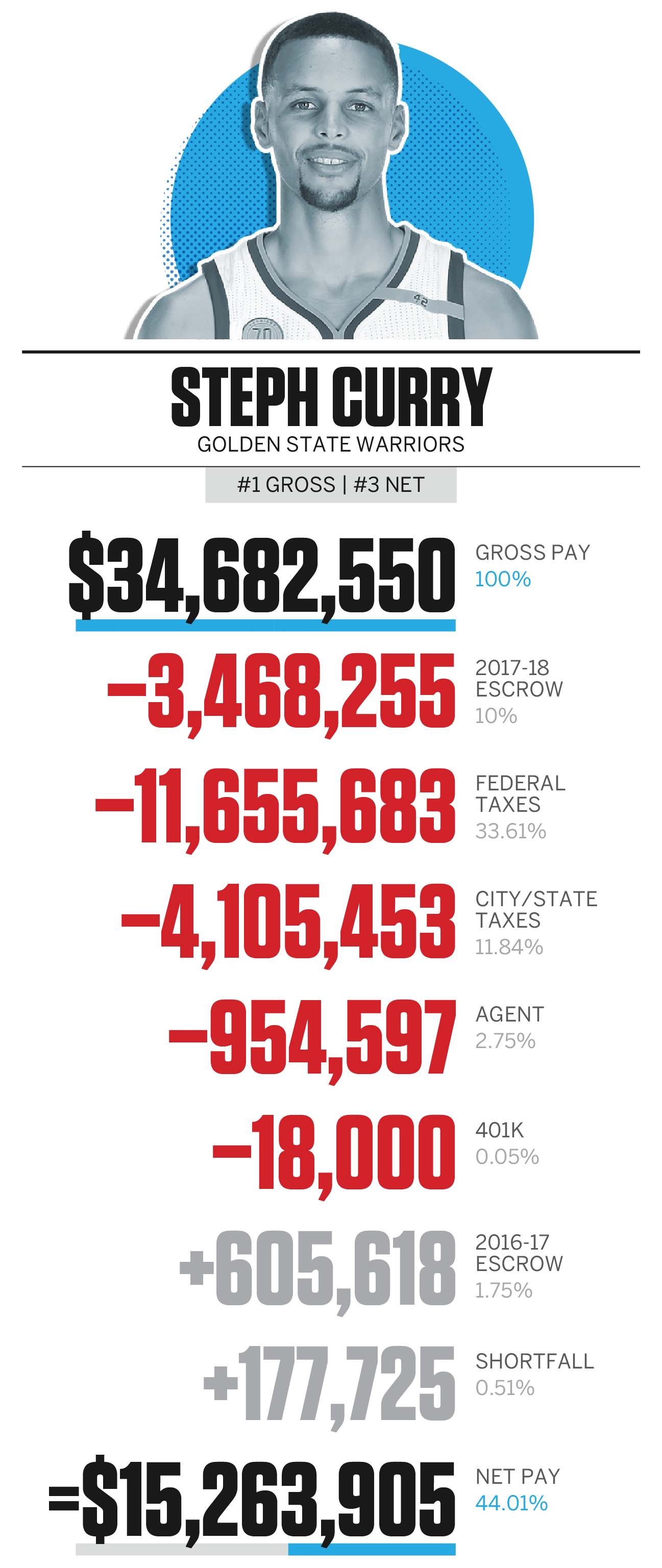 Da poco tornato in campo dopo un infortunio, Stephen Curry ha firmato in estate un rinnovo record con i Golden State Warriors: circa $202 milioni divisi in 5 anni di contratto. Nonostante abbia lo stipendio più alto dell’intera NBA, anche lui come Griffin è soggetto alle pesanti tassazioni dello Stato della California e vede così diminuire i suoi guadagni fino al 44%, che corrisponde a circa $15.2 milioni.
