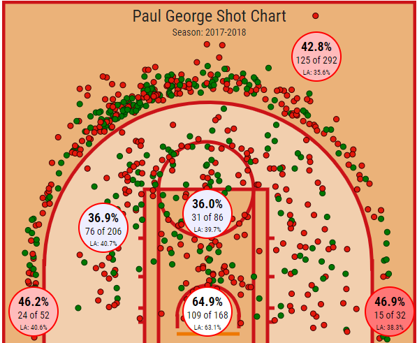 La shot chart di George ci mostra una scelta di tiro non troppo diversa dal passato: a cambiare è la qualità dei tiri derivante dalle situazioni di gioco in cui vengono presi. (Dati e mappa: NBASavant)