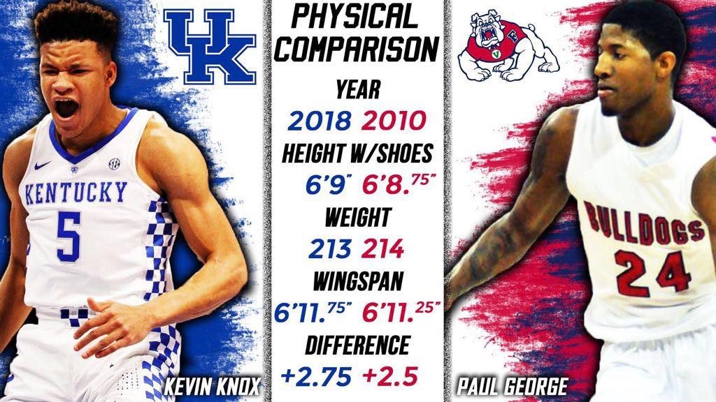 Knox, come detto, ha il dinamismo di un’ala piccola e il corpo di un’ala grande. Il frame – misurato alla Draft Combine 2018 – è eccellente: 2.06 metri d’altezza (e non è detto che non cresca altri 2-3 centimetri, vista l’età) per 96 chili di peso; 2.12 metri di wingspan; 2.75 metri di standing reach; il 4.95% di grasso corporeo. Rilevazioni molto simili a quelle fatte registrare nel 2010 da Paul George e nel 2007 da Jeff Green, per dire (torneremo sull’accostamento con questi due giocatori nella sezione “upside”).