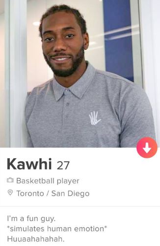 Nella descrizione invece, l’ala dei Raptors si limita a sostenere di essere un ragazzo divertente. Per dimostrarlo subito, di seguito Kawhi digita la frase “simula emozioni umane” fra due asterischi e una risata: si tratta di un riferimento al Media Day di Toronto dello scorso settembre, nel corso del quale Leonard è esploso in una risata che somigliava a quella di un robot privo di emozioni umane, che è poi diventato uno dei migliori meme del 2018, di cui abbiamo parlato in questo articolo.