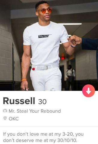 Il profilo Tinder di Russell Westbrook è forse quello meglio riuscito fra quelli di tutti i partecipanti all’All-Star Game. È semplice e diretto; ma, soprattutto, è veritiero, perché coglie alla perfezione la personalità del giocatore dei Thunder. Ad esempio l’occupazione di Westbrook è quella di Mr. Steal Your Rebound che, parafrasando, significa che Russell si accanisce su ogni rimbalzo, rischiando anche di rubarne ai propri compagni.