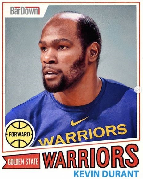 Il numero 35 di Golden State viene invece rappresentato con una prorompente calvizie, che invecchia decisamente il viso di Durant. La barba invece, è quella classica degli anni ’70: tante basette e baffetti sottili.