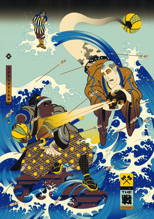 Su una piccola isola solitaria non c’è connessione con il mondo esterno: nessun tipo di comunicazione e di aiuto. È una condizione che ricorda molto l’ISO su un campo NBA: attaccante contro difensore, in uno contro uno, senza poter chiedere l’aiuto di compagni. Il difensore deve contare sulle proprie abilità per cercare di fermare l’avversario, così come l’attaccante deve stare attento a non perdere palla. L’illustrazione raffigura proprio questo uno contro uno: due Samurai che si danno battaglia: l’attaccante protegge palla, mentre il difensore cerca di sottrargliela con ogni tipo di magia. A guardarli, dall’alto, un arbitro, l’unico ad avere voce in capitolo nel duello.