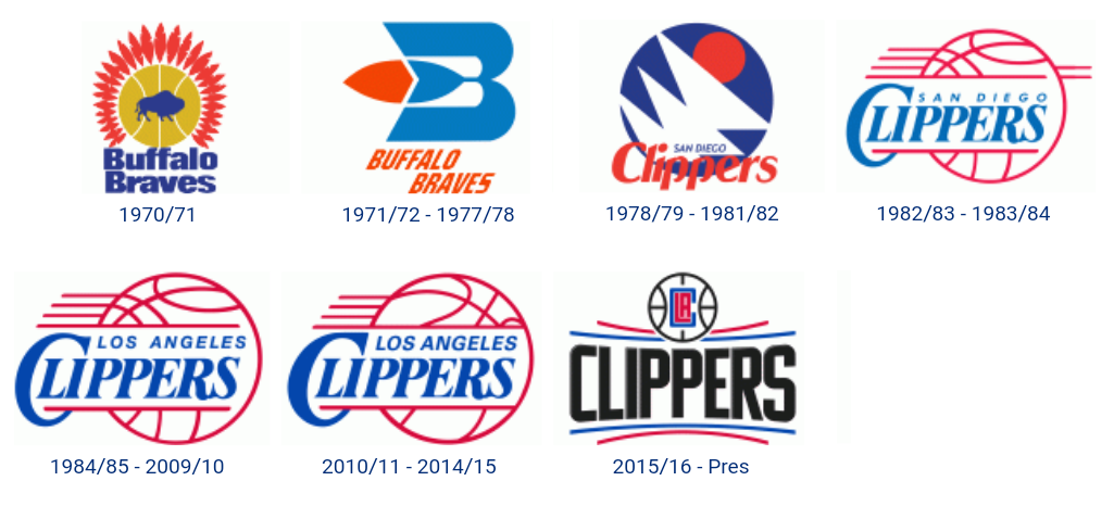 I Clippers vennero fondati nel 1970 a Buffalo, nello stato di New York, con il nome di Buffalo Braves: per simboleggiare il legame con la città, nel primo logo della franchigia venne raffigurato un bisonte. Nel 1978 la squadra si trasferì a San Diego, cambiando nome in Clippers, cui seguì ovviamente la modifica al logo. Dopo il restyling del 1982, che rimase il punto di riferimento per quelli dei successivi trent’anni, il rinnovamento più recente risale alla stagione 2015/16: i colori rosso e blu sono rimasti, ma a farla da padrone questa volta è la scritta nera Clippers.