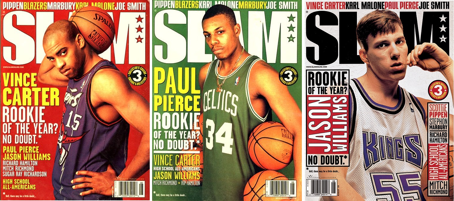 Pochi mesi più tardi, nello stesso 1999, SLAM Magazine rilasciò un altro numero, il 35° della sua storia, dalla copertina iconica. O meglio, dalle copertine iconiche: esistono infatti tre versioni differenti, ognuna con un giocatore diverso. Al momento della pubblicazione, dunque, chi acquistava quel numero poteva scegliere di avere in copertina Vince Carter, Paul Pierce o Jason Williams, ovvero i tre candidati principali per il premio di Rookie Of the Year della stagione 1998-99.