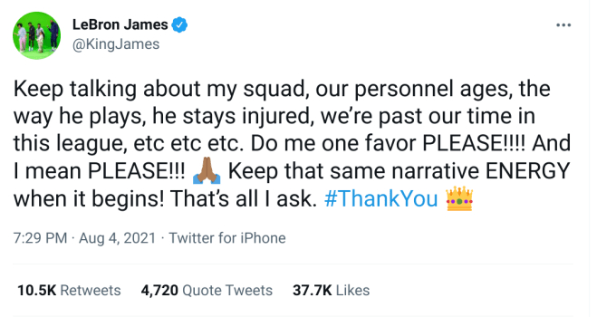 A Los Angeles arriva Carmelo Anthony, che finalmente si riunisce con l’amico fraterno James, a questi si aggiungono i grandi ritorni di Rajon Rondo e Dwight Howard, due protagonisti della cavalcata trionfale di due anni prima. Ma il nome più altisonante è sicuramente quello di Russell Westbrook, che dopo aver lasciato la sua OKC non è ancora riuscito a trovare una squadra con cui tentare di vincere. E i Lakers, con LeBron e AD, sembrano essere l’occasione perfetta. Allo stesso tempo saluta però un elemento sottovalutatissimo come Alex Caruso e non arrivano DeMar DeRozan e Buddy Hield, quest’ultimo alternativa di Westbrook. In tanti parlano di un roster costruito male, pieno di giocatori ormai consumati e soprattutto amalgamati alla bell’e meglio. Le voci negative non fanno altro che alimentare la voglia di vincere, dice però LeBron sui social.