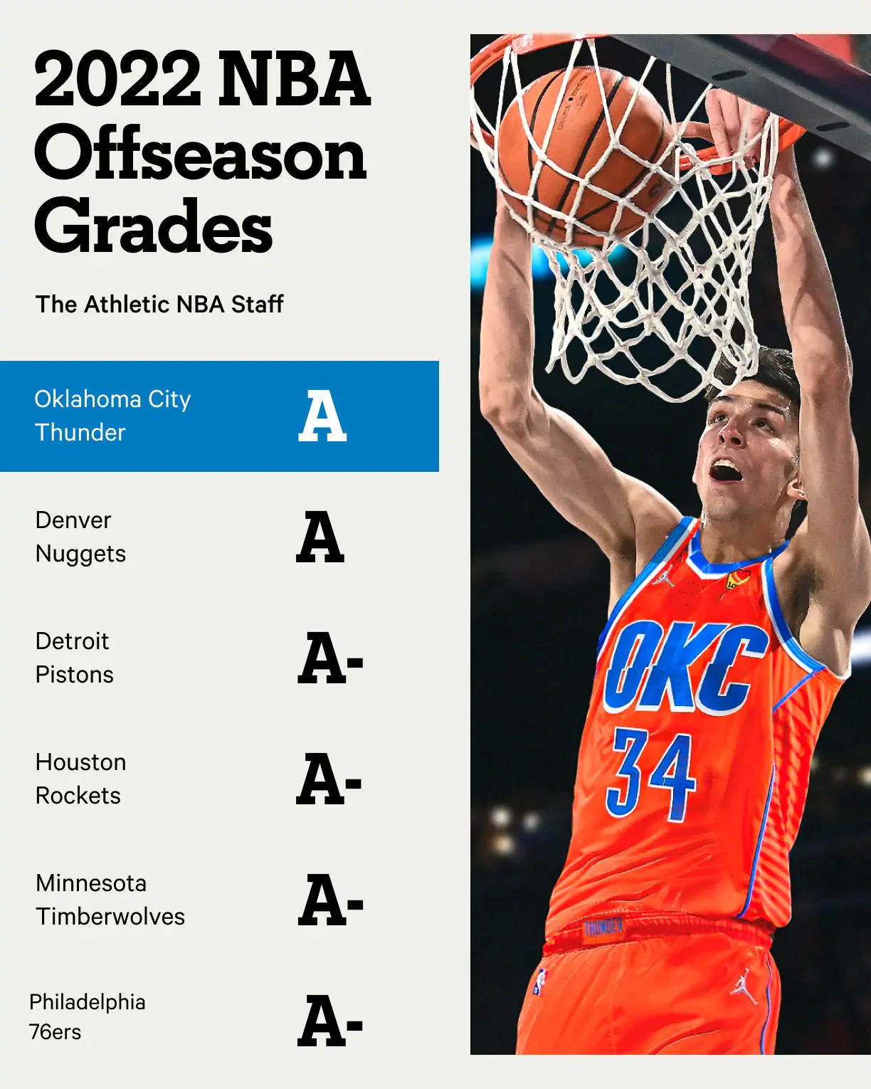 Medesimo voto e discorso per gli Oklahoma City Thunder che grazie alle scommesse del Draft (ben 4 rookie a roster – Chet Holmgren, Jalen & Jaylin Williams e Ousmane Dieng) punta ad una stagione di sviluppo. Inoltre Sam Presti ha esteso gli accordi con Luguentz Dort e Kenrich Williams, entrambi undrafted. Per Pistons, Rockets, 76ers e Timbervolwes una A-.