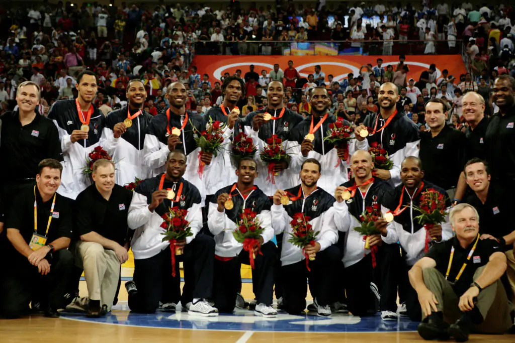 USA basketball team gathers for a photo with their gold medals after beating Spain 118-107 in the men's gold medal basketball game at the Beijing 2008 Olympics in Beijing, Sunday, Aug. 24, 2008. (AP Photo/Dusan Vranic)