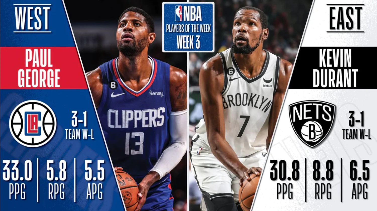 Sono Kevin Durant e Paul George i due giocatori ad essere stati premiati come migliori giocatori della terza settimana di NBA. Le due ali, rispettivamente dei Brooklyn Nets e dei Los Angeles Clippers, sono state incoronate al termine della settimana – la scorsa – che li vede non troppo differenti nelle statistiche: