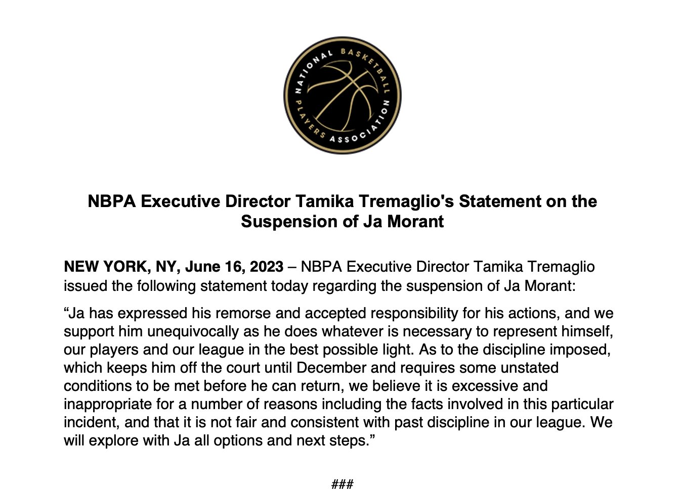 Dopo l’annuncio di Adam Silver sulla sospensione della star dei Grizzlies, non ha tardato ad arrivare la risposta della NBPA (National Basketball Players Association), l’ente che si occupa dei diritti e degli interessi dei giocatori della NBA.